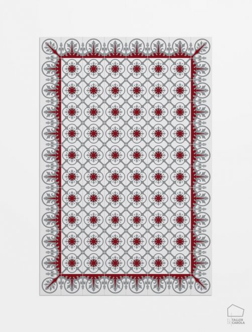 Alfombra Modernista en tonos gris y granate.
