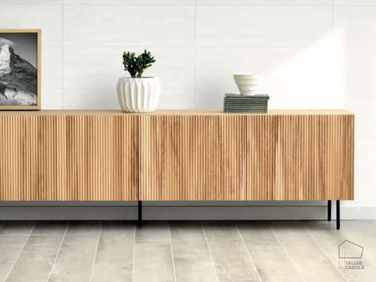 Es un mueble de TV con gran capacidad de almacenaje, formado por cuatro puertas donde las estrías de las puertas es lo más característico de su diseño.